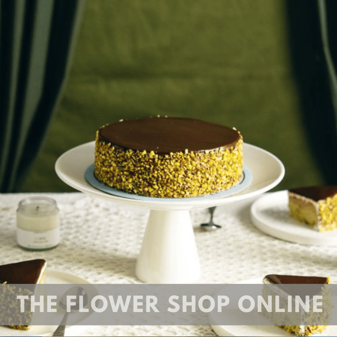 Moist and rich pistachio tres leches cake covered with our signature chocolate ganache with crushed pistachios on the sides